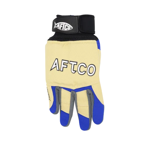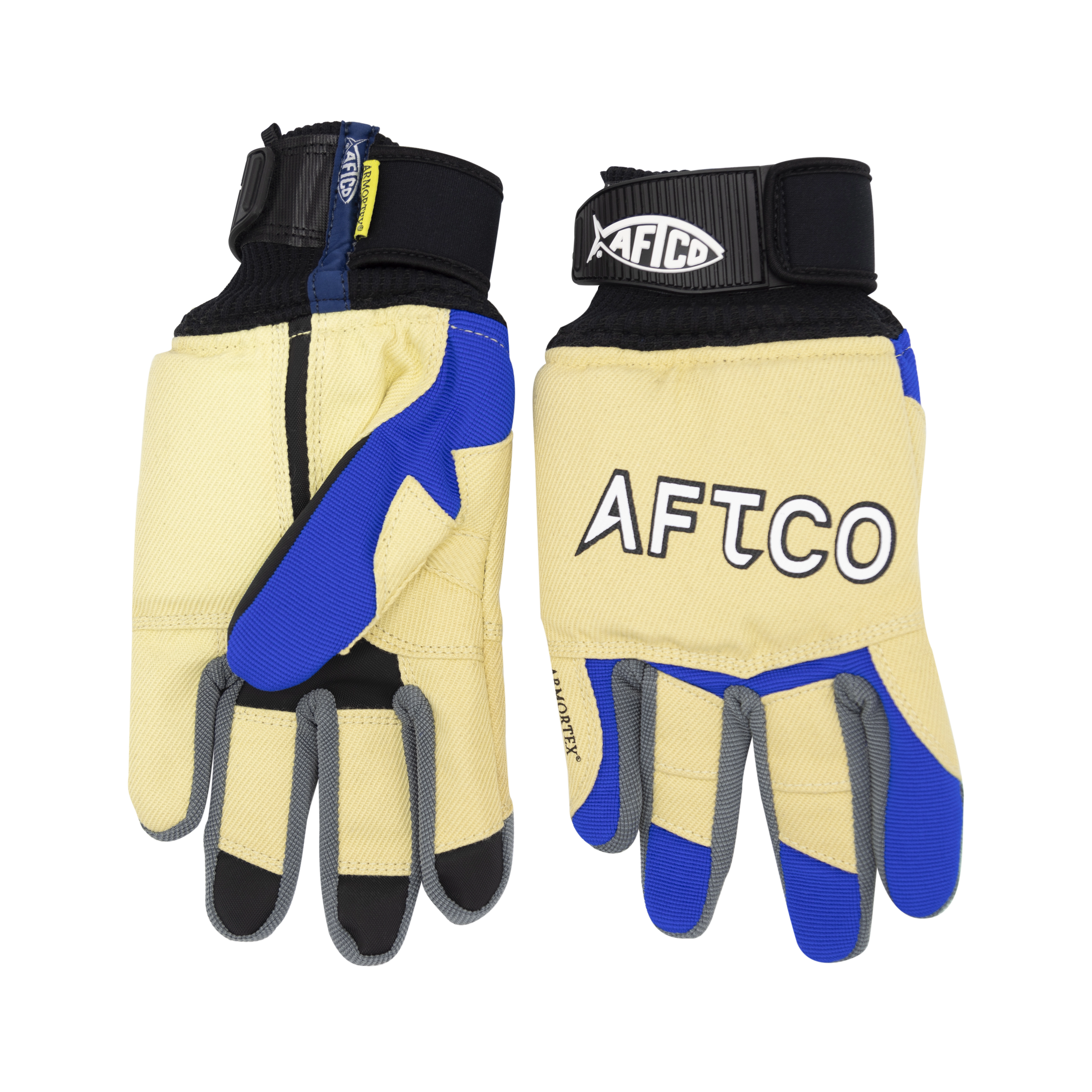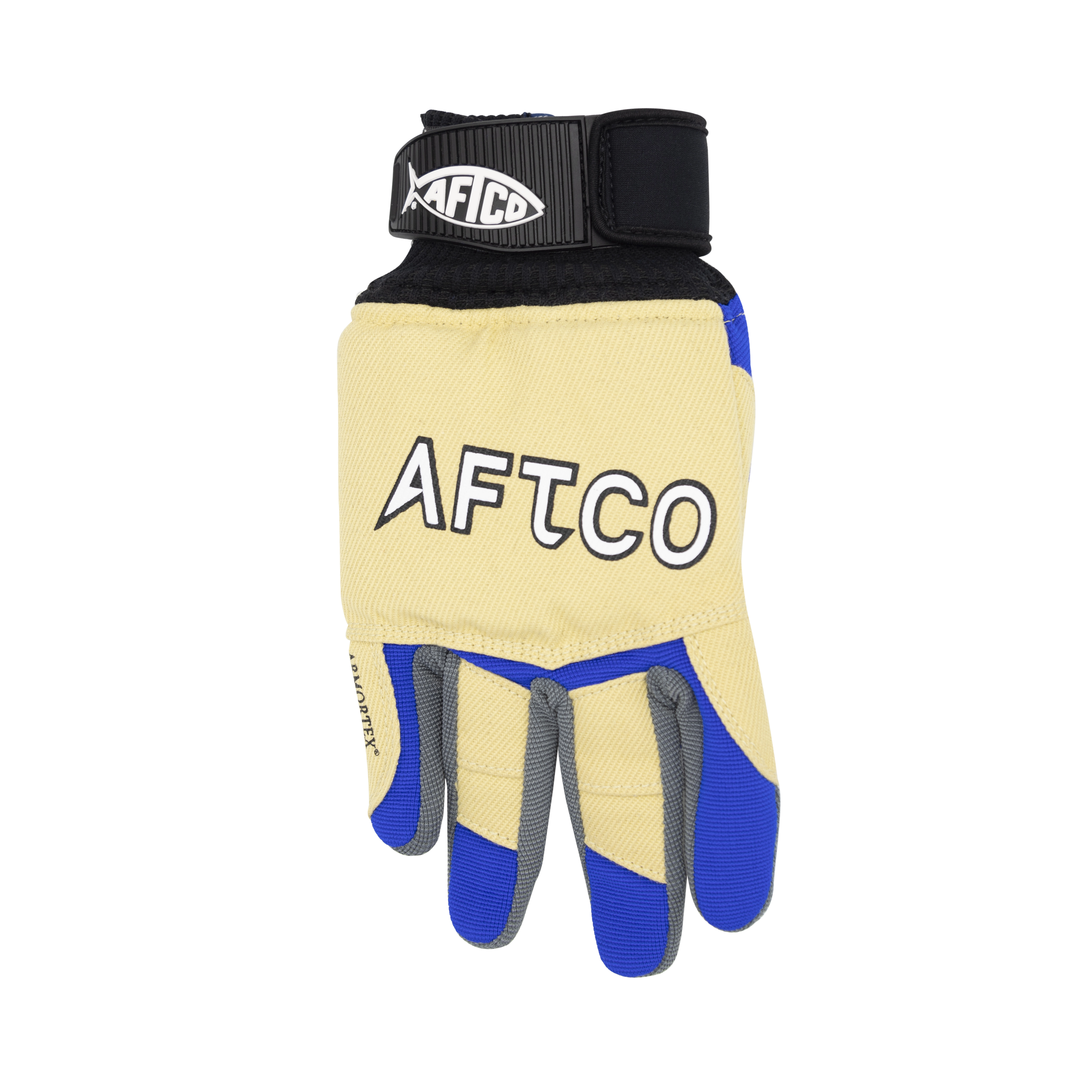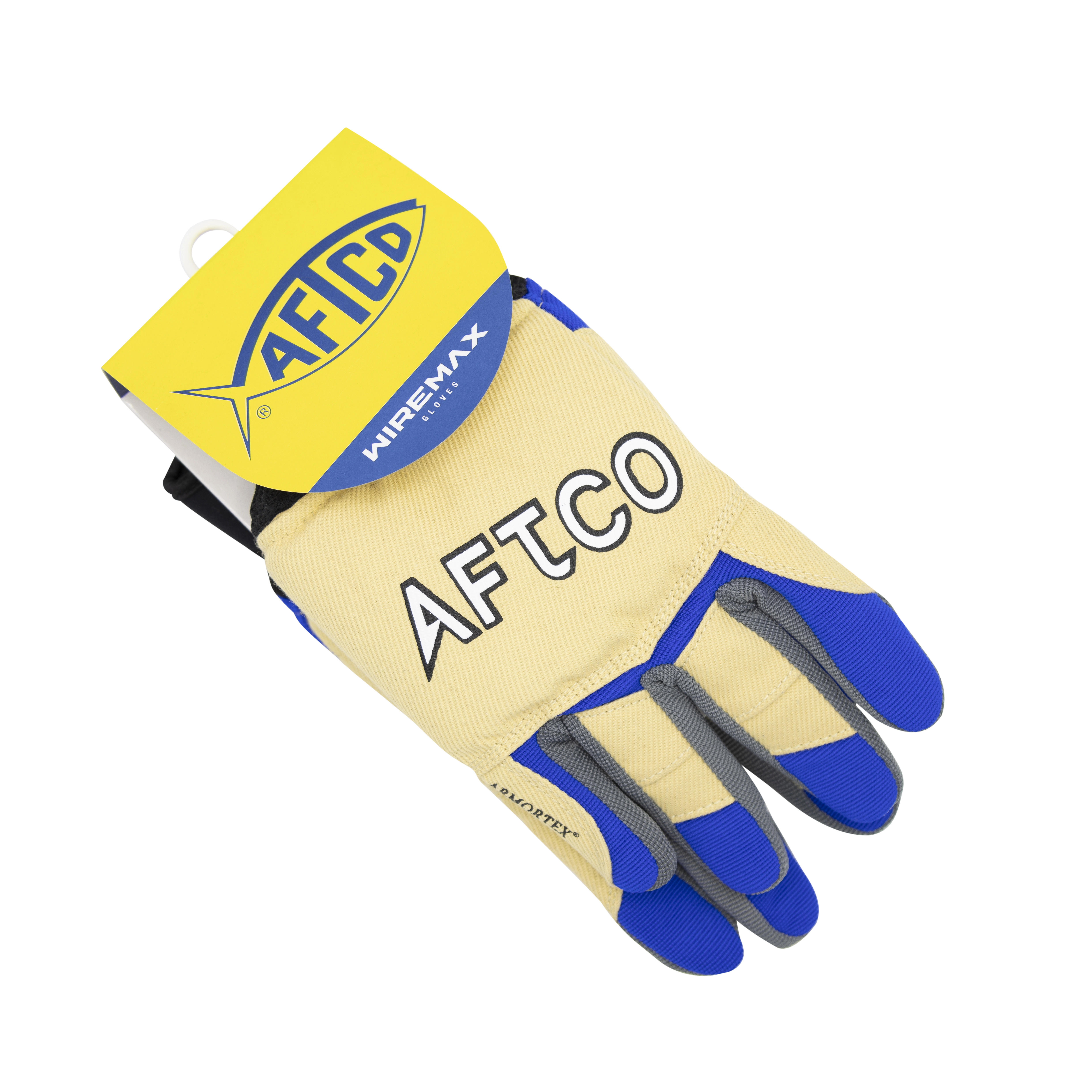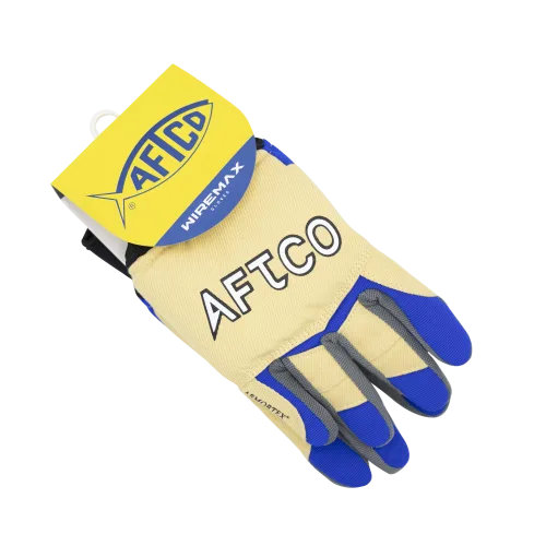 Designed with insights from renowned skipper Capt. Peter B. Wright, AFTCO Wire Max saltwater fishing gloves provide ultimate protection for handling big fish. These gloves feature durable Armortex®-wrapped EVA foam on the palm, fingers, and thumb for safe handling of mono, wire, or cable leaders. The Tacky-Grip palm and Spandura® fourchettes enhance dexterity, while foam-backed mesh keeps fingers cool. A wrap-around neoprene strap with Velcro® closure ensures a secure fit and prevents snagging.